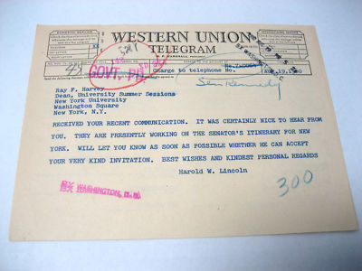 Title (ebay affiliate link): 60 Original Telegram John F Kennedy JFK Harold Lincoln New York University #8