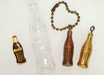 Title (ebay affiliate link): VINTAGE LOT OF 4 MINIATURE SMALL COCA COLA BOTTLES COPPER KEYCHAIN PIN GLASS