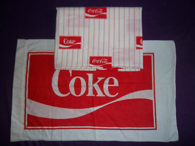 Title (ebay affiliate link): Vintage Classic COCA COLA COKE Twin Sheet Set Fabric Bedding Stripes