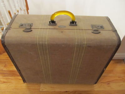 Title (ebay affiliate link): Vtg Antique Striped Tweed Leather Suitcase Northwestern Luggage Co. Home Decor