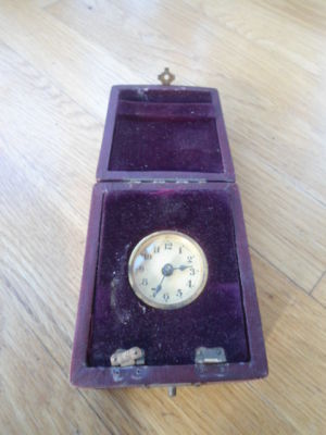 Title (ebay affiliate link): NEAT MINIATURE ANTIQUE MECHANICAL CLOCK in VELVET LINED HINGED CASE
