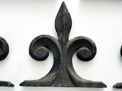 Title (ebay affiliate link): VINTAGE LOT SET OF 5 OLD CAST IRON GATE POST FLEUR DE LIS FINIALS ORIGINAL PAINT
