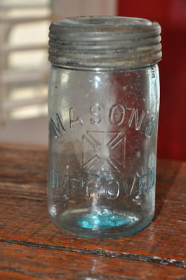 Antique Mason's Improved Jar Aqua Glass W/ Hero Cross