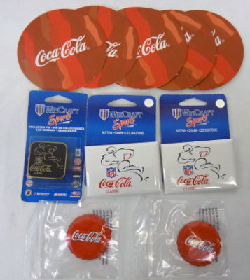 VINTAGE COCA COLA NFL WINCRAFT PIN BUTTON LOT COLLECTION COASTER BOTLE TOP RARE