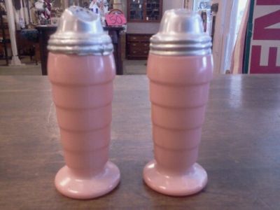 Title (ebay affiliate link): Vintage Hazel Atlas Moderntone Platonite Pastel Pink Salt & Pepper Shakers