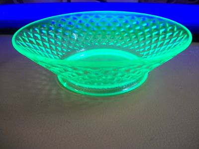 Title (ebay affiliate link): Vintage Green Vaseline Glass Diamond Quilted Pattern Bowl Glows