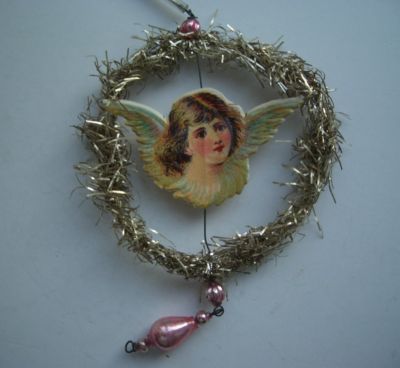 Title (ebay affiliate link): ANTIQUE TINSEL RING WITH PAPER ANGEL HEAD CHRISTMAS ORNAMENT