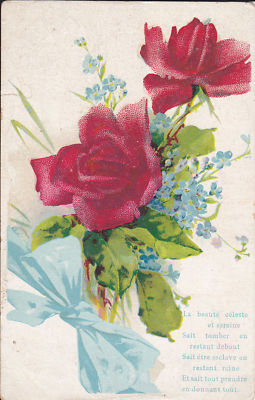 Title (ebay affiliate link): 1915 vintage French red roses forget-me-nots blue bow exceptional love poem 1031