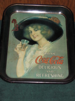 Title (ebay affiliate link): Vintage Coca Cola Tray, Approx 10 x 13 x 1, Woman w/ Black Hat & Coca cola glass