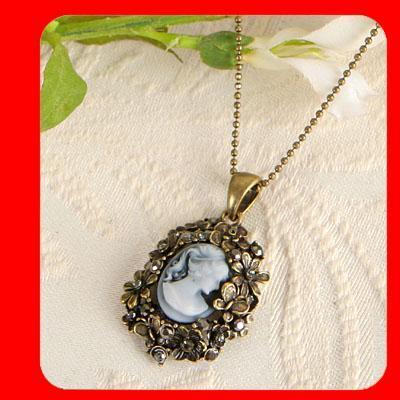 Grey Crystal Vintage ST Antique Gold GP CAMEO pendant necklace n1504
