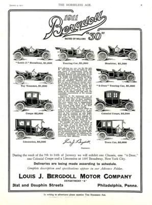 Title (ebay affiliate link): 1911 Louis J BERGDOLL Motor Cars AD. Nine Models Shown. Philadelphia, PA