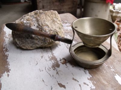 Title (ebay affiliate link): Antique 1908 Arts & Crafts Era Brass Tea Strainer Superior Wood Handle Patina+!