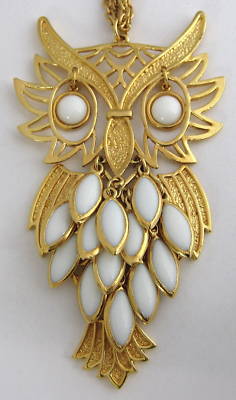 Vintage Dangling Milk Glass Cab Owl Pendant Necklace