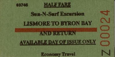 Railway ticket NSW Lismore Byron Bay economy unused half fare return Sea-n-surf
