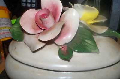 Title (ebay affiliate link): CAPODIMONTE COVERED DISH-FIVE INCHES LONG- "NUOVA CAPODIMONTE ON BOTTOM-ROSE LID