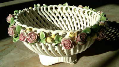 Title (ebay affiliate link): ANTIQUE ITALIAN RETICULATED BOWL Adorned Pink, & Yellow Flowers & Green Leaves