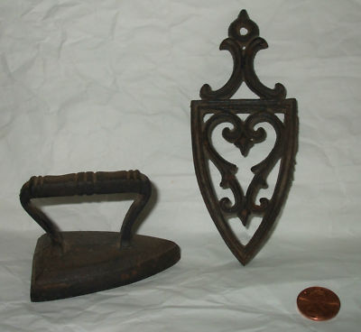 Antique Vintage Smaller Cast Iron Sad Iron Clothes Iron with Matching Trivet