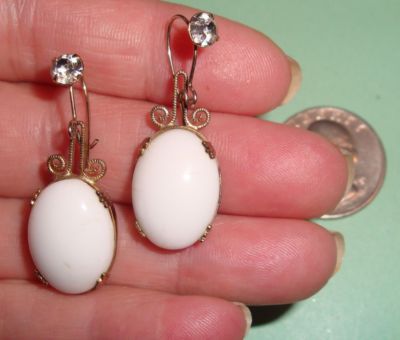 Title (ebay affiliate link): Vintage Estate Jewelry Milk Glass Cabochons Rhinestone Filigree Pierced Earrings