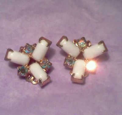 Title (ebay affiliate link): Vintage Unsigned Weiss Earrings with Milkglass and Blue Aurora Borealis Stones