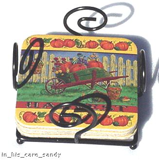 Title (ebay affiliate link): Longaberger Set of 4 Pumpkin Coasters with Wrought Iron Look Holder