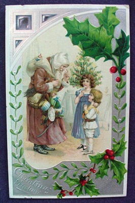 1907 CHRISTMAS POSTCARD PINK-COAT SANTA, TOYS, KIDS, HOLLY, MISTLETOE, GOOD CON