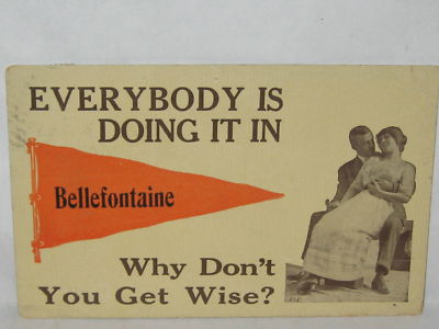 Title (ebay affiliate link): 1910 RISQUE PENNANT POSTCARD EVERYBODY DOING IT IN BELLEFONTAINE OH W/ LOVERS