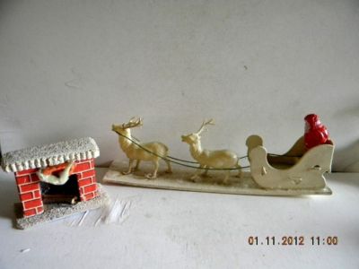Title (ebay affiliate link): 1939 Santa , Reindeer , Sleigh and 1947 fireplace, all made in the USA