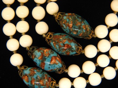 VINTAGE MILK GLASS COPPER FOILED BLUE BEAD NECKLACE