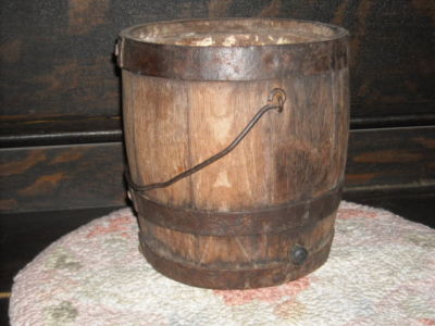 Title (ebay affiliate link): PRIMITIVE WOOD BUCKET-STEEL RINGS-WIRE BAIL-WOOD PLUG-great patina
