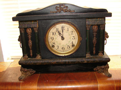 Title (ebay affiliate link): ANTIQUE SESSIONS CATHEDRAL MANTEL SHELF CLOCK FORESTVILLE CONN LIONS HEAD SCROLL