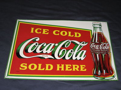 Title (ebay affiliate link): Ice Cold Coca-Cola sold here tin sign bottle trademark reg patented Dec 25, 1923