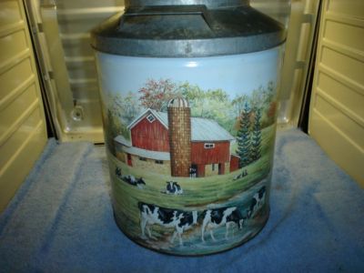 A 13" TIN MILK CAN WITH AMISH FALL SCENE REMOVABLE LID