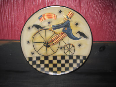 Title (ebay affiliate link): OOAK, HP, New England Folk Art Uncle Sam Riding a Bicycle Decorative Plate
