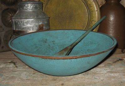 Title (ebay affiliate link): Wood Dough BOWL*Antique Bird Egg BLUE*+Wooden Spoon-Primitive Decor-Centerpiece