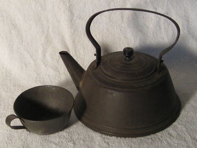 ANTIQUE COUNTRY KITCHEN TIN TEAPOT & TIN CUP