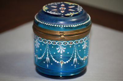 Antique Cobalt Blue Glass Jar w/ Lid Hand Painted