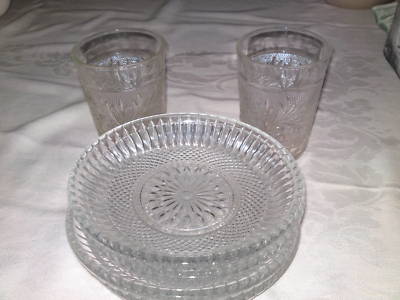 Lot of 4 Clear Depression Plates and 2 Clear Glasses