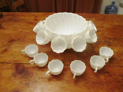 VINTAGE WHITE MILK GLASS PUNCH BOWL W/ 12 CUPS