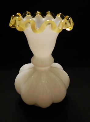 Title (ebay affiliate link): VINTAGE FENTON Milk Glass & YELLOW/AMBER CREST Melon Shaped RUFFLED VASE!