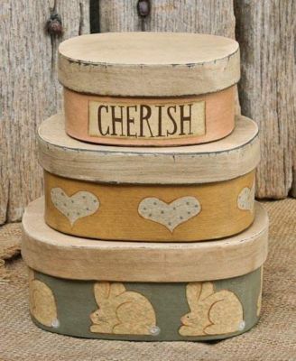 Title (ebay affiliate link): SET OF 3 CHERISH NESTING BOXES RABBITS HEARTS PAPER MACHE HOLIDAY HOME DECOR