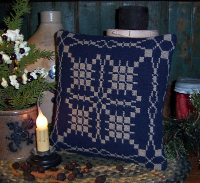 Title (ebay affiliate link): Primitive Woven Coverlet Antique Vtg Style Navy Blue Accent Pillow Wool Backing