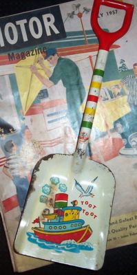 VINTAGE OHIO ART TOOT TOOT TUG BOAT LITHO TIN SHOVEL