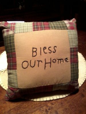 Title (ebay affiliate link): PRIMITIVE/COUNTRY STITCHERY TEA CABIN "BLESS OUR HOME" PATCH WORK PILLOW~10"~NEW
