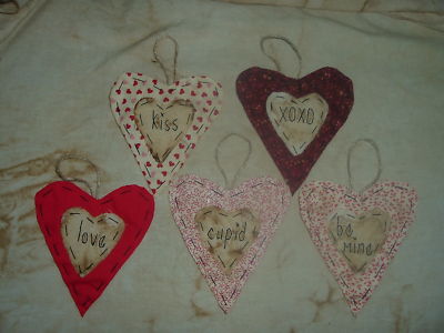 Title (ebay affiliate link): 5 Primitive FLAT CONVERSATION VALENTINE hearts bowl fillers-w/stitched words