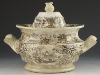 ROMANTIC BROWN TRANSFERWARE COVERED SUGAR, 1860