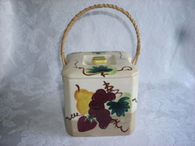 Title (ebay affiliate link): ANTIQUE BISCUIT JAR Square w Wicker Handle Colorful Fruit Design 5X5X5" GC