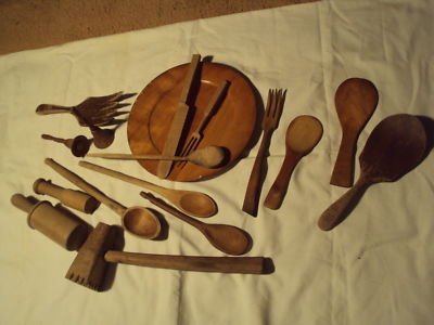 Title (ebay affiliate link): Large Collection CARVED WOOD Kitchen Utensils Masher FORK SPOONS PLATE