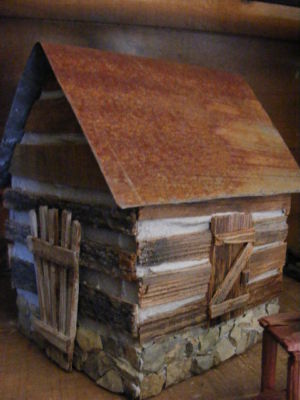 Title (ebay affiliate link): HANDMADE LOG CABIN W STONE FOUNDATION TRELLIS WOOD FOLK ARTIST PAT BROYLES