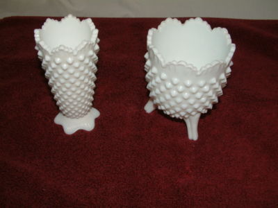 2 Milk Glass "Fenton" Hobnail Vases - One is 3 legged