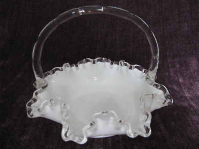 Title (ebay affiliate link): Milk Glass ruffled, basket style candy dish with glass handle in mint condition
